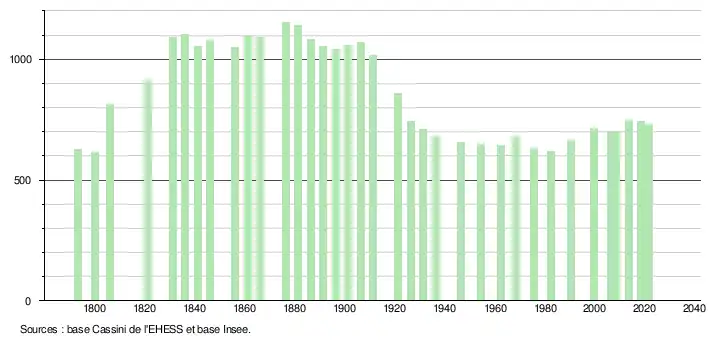 L'évolution du nombre d'habitants est connue à travers les recensements de la population effectués dans la commune depuis 1793. Pour les communes de moins de 10 000 habitants, une enquête de recensement portant sur toute la population est réalisée tous les cinq ans, les populations légales des années intermédiaires étant quant à elles estimées par interpolation ou extrapolation[18]. Pour la commune, le premier recensement exhaustif entrant dans le cadre du nouveau dispositif a été réalisé en 2008[19].