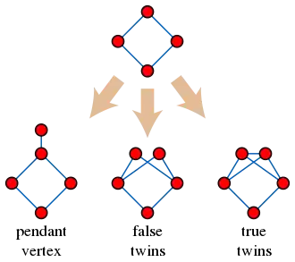 - Le graphe peut être construit à partir d'un sommet unique par une séquence d'opérations qui ajoutent un nouveau sommet pendant (de degré un) ou qui dupliquent un sommet existant sous réserve que le nouveau sommet dupliqué est adjacent à son jumeau (vrai jumeaux) sauf si les voisins des jumeaux forment une clique. Ces trois opérations, produisent tous les graphe à distance héréditaire. Pour obtenir tous les graphes ptolémaïques, il ne suffit pas d'utiliser des sommets pendants et de vrais jumeaux ; le cas exceptionnel des faux jumeaux est aussi nécessaire[6].