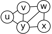 - L'intersection de deux cliques maximales chevauchantes est un séparateur qui sépare les différences des deux cliques[3]. Dans le graphe gemme, ce n'est pas le cas : les cliques uvy et wxy ne sont pas séparées par leur intersection y, car l'arête vw relie les cliques et évite l'intersection.