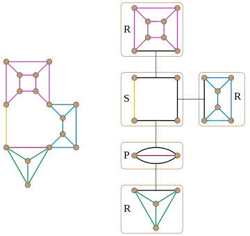 Un arbre SPQR est une structure arborescente qui peut être définie pour un graphe sommet-connexe arbitraire ; à chaque sommet est associé un graphe ou multigraphe. Il a des nœuds source S, qui sont analogues aux opérations de composition en série dans les graphes série-parallèle, des nœuds puits P, qui sont analogues aux opérations de composition parallèle dans les graphes série-parallèle, et des nœuds R, qui ne correspondent pas aux compositions série-parallèle. Un graphe biconnexe est série-parallèle si et seulement s'il n'y a pas de nœuds R dans son arbre SPQR.