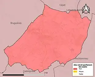Le retrait-gonflement des sols argileux est susceptible d'engendrer des dommages importants aux bâtiments en cas d’alternance de périodes de sécheresse et de pluie. La totalité de la commune est en aléa moyen ou fort (88,8 % au niveau départemental et 48,5 % au niveau national). Sur les 1 473 bâtiments dénombrés sur la commune en 2019, 1 473 sont en aléa moyen ou fort, soit 100 %, à comparer aux 98 % au niveau départemental et 54 % au niveau national. Une cartographie de l'exposition du territoire national au retrait gonflement des sols argileux est disponible sur le site du BRGM[24],[Carte 3].