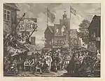 Après quelques œuvres notables, comme le diptyque Beer Street et Gin Lane (1751) et la série de quatre gravures Les Quatre Étapes de la cruauté (même année) ou encore l'estampe Columbus Breaking the Egg (en) (1752) tirée pour illustrer le bon de souscription à son ouvrage L'Analyse de la beauté (1753), Hogarth réalise une dernière série de tableaux accompagnée des pendants gravés : Humours of an Election (1754-1755, quatre sujets)[8].