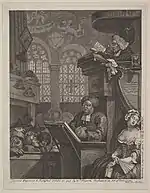 William Hogarth a réalisé plusieurs œuvres sous forme de séries, dont les aspects réalise, contemporain et narratif ont une visée morale et éducative. Il aborde des sujets politiques, religieux et sociaux, tout en usant également d'« inventivité et de verve » dans de petites œuvres comme des billets de souscription pour ses gravures[8]. Au total, Hogarth produit plus de deux cent cinquante gravures, dessinées ou gravées[8].
