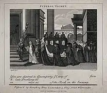 | Invitation burlesque à un enterrement (attribué à Hogarth) | n. d. | Eau-forte et burin, 82 × 98 mm | n. c. | British Museum | ![]() Burlesque funeral ticket de Thomas Cook d'après William Hogarth (1809). |