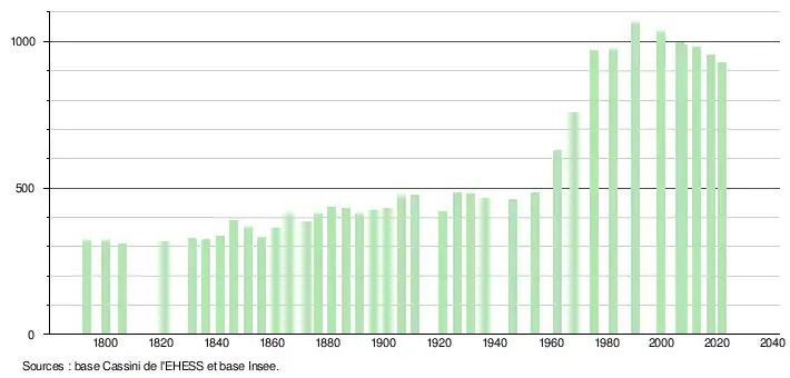 L'évolution du nombre d'habitants est connue à travers les recensements de la population effectués dans la commune depuis 1793. Pour les communes de moins de 10 000 habitants, une enquête de recensement portant sur toute la population est réalisée tous les cinq ans, les populations légales des années intermédiaires étant quant à elles estimées par interpolation ou extrapolation[28]. Pour la commune, le premier recensement exhaustif entrant dans le cadre du nouveau dispositif a été réalisé en 2007[29].