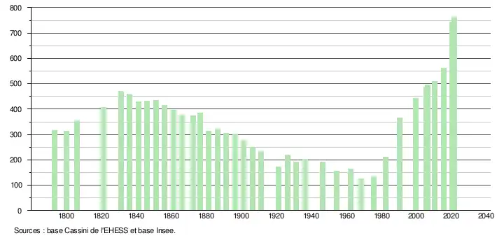 | L'évolution du nombre d'habitants est connue à travers les recensements de la population effectués dans la commune depuis 1793. Pour les communes de moins de 10 000 habitants, une enquête de recensement portant sur toute la population est réalisée tous les cinq ans, les populations légales des années intermédiaires étant quant à elles estimées par interpolation ou extrapolation[32]. Pour la commune, le premier recensement exhaustif entrant dans le cadre du nouveau dispositif a été réalisé en 2005[33]. En 2021, la commune comptait 762 habitants[Note 5], en augmentation de 35,83 % par rapport à 2015 (Haute-Garonne : +7,43 %, France hors Mayotte : +1,84 %). |