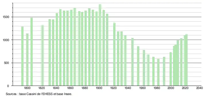 L'évolution du nombre d'habitants est connue à travers les recensements de la population effectués dans la commune depuis 1793. Pour les communes de moins de 10 000 habitants, une enquête de recensement portant sur toute la population est réalisée tous les cinq ans, les populations légales des années intermédiaires étant quant à elles estimées par interpolation ou extrapolation[17]. Pour la commune, le premier recensement exhaustif entrant dans le cadre du nouveau dispositif a été réalisé en 2004[18].