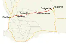 Carte du sud-ouest de l'Australie-Occidentale avec la 'Great Eastern Highway en rouge.