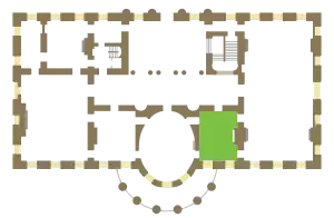 La pièce mesure approximativement 8,40 m par 6,75 m. Elle possède six portes qui donnent vers le Cross Hall, l'East Room, le portique Sud et la Blue Room.