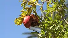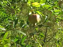 Le fruit, en forme de pomme, passant avec le temps du vert au rouge orange, doit être considéré comme un cas limite de baie puisque la pulpe n’est pas charnue, mais elle n’est pas filandreuse non plus. Son diamètre peut atteindre 15 centimètres et elle est divisée par de nombreuses parois. Ainsi, se forment des loges dans lesquelles se trouvent de nombreuses graines triangulaires mesurant jusqu’à 15 millimètres qui sont entourées d’une enveloppe (le sarcotest) translucide très juteuse de couleur rouge foncé à rose clair qui éclate à la moindre pression. En tout, il y a à peu près entre 400 et 868 graines dans chaque fruit[7].