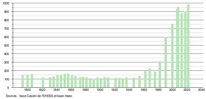 L'évolution du nombre d'habitants est connue à travers les recensements de la population effectués dans la commune depuis 1793. Pour les communes de moins de 10 000 habitants, une enquête de recensement portant sur toute la population est réalisée tous les cinq ans, les populations légales des années intermédiaires étant quant à elles estimées par interpolation ou extrapolation[21]. Pour la commune, le premier recensement exhaustif entrant dans le cadre du nouveau dispositif a été réalisé en 2007[22].