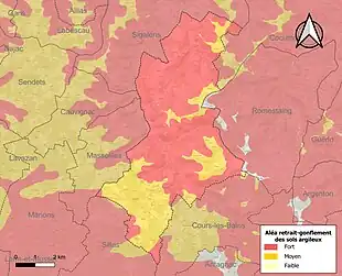 Le retrait-gonflement des sols argileux est susceptible d'engendrer des dommages importants aux bâtiments en cas d’alternance de périodes de sécheresse et de pluie. La totalité de la commune est en aléa moyen ou fort (67,4 % au niveau départemental et 48,5 % au niveau national). Sur les 584 bâtiments dénombrés sur la commune en 2019, 584 sont en aléa moyen ou fort, soit 100 %, à comparer aux 84 % au niveau départemental et 54 % au niveau national. Une cartographie de l'exposition du territoire national au retrait gonflement des sols argileux est disponible sur le site du BRGM[24],[Carte 2].