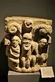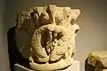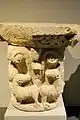 - Sur le premier chapiteau figurent deux oiseaux qui picorent une feuille de vigne. Le deuxième chapiteaux montre un homme, avec barbe et moustache, ithyphallique et avec un scrotum démesuré, qui trône entre deux personnages nues. Il enlace, à sa droite une femme, dont le bras droit est mordu par un lion. À sa gauche, un personnage homme/femme (?) est assis, sa main droite entre ses jambes. Le groupe est encadré par des lions rampants, la tête tournée en arrière. Sur le troisième chapiteau, deux lions adossés avec queue rentrant.