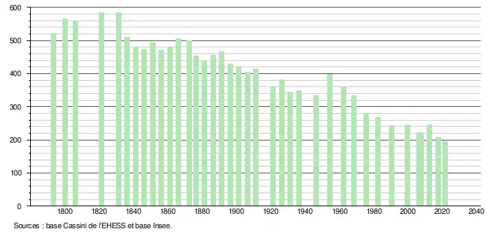 L'évolution du nombre d'habitants est connue à travers les recensements de la population effectués dans la commune depuis 1793. Pour les communes de moins de 10 000 habitants, une enquête de recensement portant sur toute la population est réalisée tous les cinq ans, les populations légales des années intermédiaires étant quant à elles estimées par interpolation ou extrapolation[13]. Pour la commune, le premier recensement exhaustif entrant dans le cadre du nouveau dispositif a été réalisé en 2007[14].