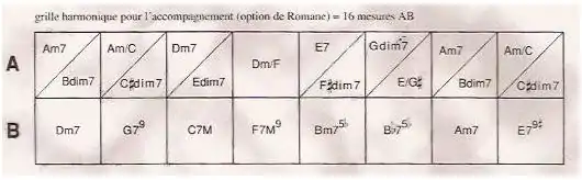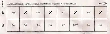 Une grille harmonique contient souvent huit cases par ligne. Chaque case correspond à une mesure, la plupart du temps à quatre temps de type 4/4 (quatre noires dans la mesure). Les lettres correspondent aux notes fondamentales des accords (A=la, B=si, C=do, D=ré, E=mi, F=fa, G=sol) auxquelles on ajoute des indications supplémentaires concernant le mode ou la nature de l'accord (par exemple m=mineur, par défaut la lettre sans indication correspond à un accord parfait majeur). Dans la ligne A, le signe dans les cases ne contenant pas de lettre indique que chaque accord est répété, donc joué sur deux mesures de suite. Enfin, il s'agit de jouer la ligne A puis la B.