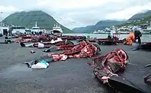 Chaque année, certains habitants tuent par centaines des globicéphales noirs, principale cible de la chasse, mais également des dauphins à flancs blanc et des grands dauphins qui s'aventurent dans les fjords de l'archipel[2]. Cette chasse est régulée par les autorités féroïennes[3][source insuffisante]. Elle est controversée en Europe, principalement quant à son éthique, mais aussi quant à la toxicité de la viande de globicéphale et d'autres cétacés, prédateurs qui ont au cours de leur vie bioaccumulé de nombreux polluants marins (HAP, PCB et métaux lourds dont mercure en particulier)[4].