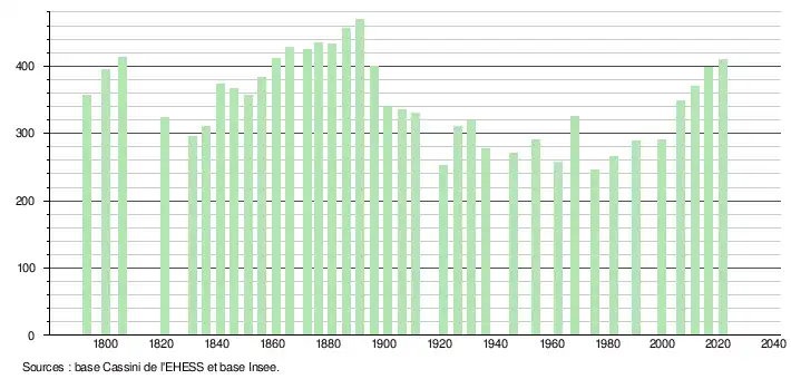L'évolution du nombre d'habitants est connue à travers les recensements de la population effectués dans la commune depuis 1793. Pour les communes de moins de 10 000 habitants, une enquête de recensement portant sur toute la population est réalisée tous les cinq ans, les populations légales des années intermédiaires étant quant à elles estimées par interpolation ou extrapolation[45]. Pour la commune, le premier recensement exhaustif entrant dans le cadre du nouveau dispositif a été réalisé en 2006[46].