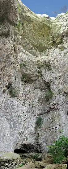 L’ouverture de la grotte proprement dite se trouve à la base d'un grand porche en forme de demi-cylindre vertical, couvert d’une coupole, creusé dans la falaise calcaire du Jurassique moyen.
