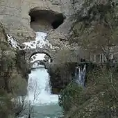 À l'ouest de la grotte, on trouve des ruines romaines occupant une terrasse naturelle aménagée. Les constructions se sont effondrées à la suite de glissements de terrain. La plus identifiable aujourd'hui correspond à un temple élevé sur podium et long d'environ 40 m. De plan tétrastyle et d’ordre corinthien il reposait sur des fondations de blocs de grès ocre jaune[2].