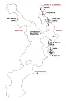 La longueur du système de grottes est d'un peu plus de 60 m, la couverture rocheuse atteint un maximum de 30 m et est couverte de spéléothèmes en de nombreux endroits, ainsi que des concrétions. L'existence d'au moins une autre entrée est démontrée par le cône de débris sous-jacent, dans la zone proche de l'entrée actuelle. Souvent, ces puits karstiques se transformaient en pièges naturels pour les animaux et les humains. Cela semble s'être produit aussi dans notre cas, à en juger par les restes d'animaux éparpillés au fond de la grotte et par le squelette de l'Homme d'Altamura qui semble s'être traîné avec le radius et une omoplate fracturée au fond d'un tunnel étroit, cherchant peut-être une issue.
