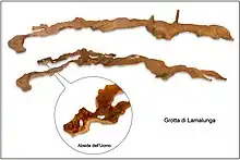 - (it) Cet article est partiellement ou en totalité issu de l’article de Wikipédia en italien intitulé « Grotta di Lamalunga » (voir la liste des auteurs).