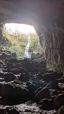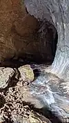 L'entrée du gouffre de Réveillon, en forme de grotte, est située dans une propriété privée.