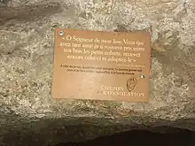 Sur la droite de la salle, des escaliers permettent de rejoindre la partie basse de la grotte, un autre lieu de prière est aménagé pour les familles ayant perdu un enfant in utero, ou mort-né. Sur le mur, des petites plaques rappellent les noms des enfants disparus[15].