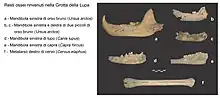 De nombreux restes osseux attribuables à un ou plusieurs spécimens d'ours brun (Ursus arctos), de loup gris (Canis lupus ), de cerf élaphe (Cervus elaphus) et de chèvre (Capra hircus) ont été trouvés du côté amont de la grotte.