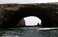 Les salles des grottes marines s'effondrent parfois laissant un gouffre littoral. Certains de ces gouffres peuvent être très grands, comme dans le Oregon's Devil's Punchbowl, ou le Queen's Bath sur la côte de Na Pali, dans l'île de Kauai. De nombreuses grottes et plusieurs gouffres littoraux peuvent être observés dans le comté de Mendocino, Californie. Les petites péninsules et les pointes rocheuses abritent souvent des grottes qui finissent par les traverser de part en part sous l'action érosive s'attaquant aux deux flancs. Se forme alors un tunnel et éventuellement une arche, qui en s'écroulant à son tour laissera un stack le long de la côte[7]. L'île Anacapa, dans les Channel Islands de Californie, a été divisée en plusieurs îlots par un tel processus[9].