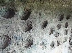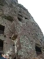 Originaire de l'éruption du volcan de Jonas, le site s’est formé de plusieurs cônes alignés sur une longue fissure. Toutes les grottes ont été creusées par les hommes, dont les premiers furent les Celtes en 400 av. J.-C. (autel celtique et statue gallo-romaine). La construction s’est poursuivie jusqu’au Moyen Âge vers le XIIIe siècle. La falaise fait 500 mètres de long sur 100 m de haut et la partie est était habitée par le seigneur alors que la partie nord était occupée par les villageois et les animaux. Composé d’environ 70 pièces aménagées dans le tuf sur cinq étages, ce village pouvait abriter 600 personnes composées de moines, militaires et paysans.
