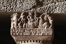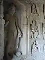 Un peu plus haut se trouve un vihara avec un grand porche avancé soutenu par des piliers de type Elephanta à l'avant et par des piliers carrés à l'arrière, comme dans la grotte 15 d'Ajanta . La porte du hall est entourée de moulures et sur le mur du fond se trouvent des restes de fresques de plusieurs bouddhas. Dans le sanctuaire se trouve une image, et de petites images sont sculptées dans les parois latérales, dans lesquelles se trouvent également deux cellules. Dans un grand renfoncement à droite du porche se trouve une figure de Bouddha assis, et à sa gauche se trouve Padmapāṇi ou Sahasra bahu lokeswara , avec dix têtes supplémentaires empilées sur la sienne ; et de l'autre côté de la chambre se trouve la litanie avec quatre compartiments de chaque côté. Il s'agit d'une grotte plus récente[8].