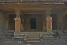 La véranda a deux piliers à l'avant, et l'écran au-dessus d'eux est soutenu par cinq ouvertures au-dessus. Dans le côté gauche de la cour se trouvent deux pièces, l'une entrant par l'autre, mais évidemment postérieures à la grotte. L'extérieur contient de nombreuses sculptures. De chaque côté du terrain se trouve un pilier attenant ; au sommet de celle du côté ouest se trouvent quatre lions, comme à Karle ; de l'autre, trois grosses figures trapues semblables à celles du pilier de la cour de la grotte de Jaina, connue sous le nom d'Indra Sabha, à Ellora ; ceux-ci supportaient probablement une roue. Devant la véranda se trouve un porche en bois.