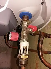 - la vanne : elle contrôle l'arrivée d'eau froide du chauffe-eau. Cette vanne, souvent manipulable par une petite poignée noire ou rouge, est située dans la partie haute du groupe de sécurité. Sa position normale est ouverte (la poignée est parallèle au tuyau d'arrivée d'eau froide) ;