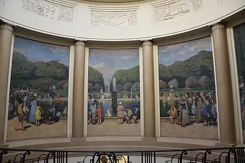 « L’escalier d’honneur. Dans la partie en hémicycle de la cage d’escalier, cinq grandes toiles tendues d’Henri Martin (1860-1943) représentent le jardin du Luxembourg situé dans le 6e arrondissement (…). Ce polyptyque réalisé à la fin de sa carrière (1935) constitue un exemple abouti du mouvement post-impressionniste dont Henri Martin, grand maître de la lumière, est un des représentants les plus emblématiques[5] »