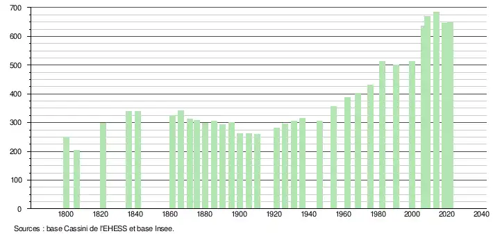 L'évolution du nombre d'habitants est connue à travers les recensements de la population effectués dans la commune depuis 1800. Pour les communes de moins de 10 000 habitants, une enquête de recensement portant sur toute la population est réalisée tous les cinq ans, les populations légales des années intermédiaires étant quant à elles estimées par interpolation ou extrapolation[18]. Pour la commune, le premier recensement exhaustif entrant dans le cadre du nouveau dispositif a été réalisé en 2008[19].