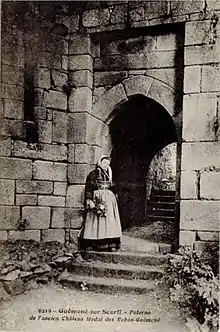 Le château est attaqué à de nombreuses reprises au cours de sa longue histoire : par les troupes d'Henri Plantagenêt au XIIe siècle, par celles du roi d'Angleterre Édouard III en (le château est incendié), par des Ligueurs en 1589 (mais les troupes royales qui l'occupaient parvinrent à s'y maintenir) et par des chouans le . Il est occupé par les Anglais pendant la guerre de Succession de Bretagne et par les Espagnols pendant les Guerres de la Ligue (ses fortifications sont démolies peu après). Il connaît plusieurs remaniements au cours des siècles. Un premier château en bois voit le jour. À la construction en bois, succède un donjon de pierre. Puis les Anglais, après s'être emparé de la place, font de grands travaux : assèchement des marais et construction d'un nouveau château qui est presque achevé en 1356. Jeanne de Navarre fait construire par la suite une étuve rappelant les thermes romains, connu sous le nom de « Bains de la Reine ». Bien que Marie de Rohan le désarme pour en faire un château de plaisance de style Renaissance, il est progressivement délaissé par ses propriétaires à partir du XVIIe siècle. Ceux-ci préfèrent en effet résider sur leurs terres en Touraine ou profiter des fastes de la vie à la cour et ne se rendent plus que rarement sur leurs terres guémenoises[29]. Le château tombe progressivement en ruines, servant même de carrière pour la construction de maisons ; le donjon est abattu en 1693.