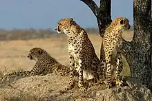 Comme les autres guépards, ils sont menacés et dépassés par les plus grands prédateurs de leur région. Ils sont menacés par les lions et les hyènes tachetées car ils peuvent voler leurs carcasses. Les guépards abandonnent leurs repas à des hyènes tachetées. Cependant, des coalitions de guépards mâles adultes peuvent chasser les prédateurs, et un guépard seul peut chasser les chacal et un chien sauvage solitaire[39].