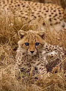 Les guépards femelles peuvent se reproduire entre 13 et 16 mois et l'âge typique de maturité sexuelle se situe 20 et 23 mois[37]. La gestation peut durer de 90 à 95 jours. Les naissances de guépardeaux ont lieu principalement de novembre à janvier en Namibie et de novembre à mars en Zambie[8]. Les femelles chassent en solitaire, mais les petits guépards accompagnent leur mère pour apprendre à chasser seuls à partir de l'âge de 5-6 semaines. Après que les petits atteignent l'âge de 18 mois, la mère laisse ses petits et les frères et sœurs restent en groupe pendant quelques mois jusqu'à ce que les sœurs quittent le groupe et que les frères restent ensemble. Les guépardeaux mâles peuvent former des alliances avec d'autres mâles après s'être séparés de leur mère[38].