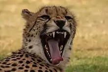 Le guépard est un chat de taille moyenne. La taille totale d'un guépard mâle adulte peut mesurer de 168 à 200 cm et 162 à 213 cm pour les femelles. Les guépards adultes mesurent 70 à 90 cm de long à partir du haut à l'épaule. Les mâles sont légèrement plus grands que les femelles et ont une tête légèrement plus grosse avec des incisives plus larges et des mandibules plus longues[8].