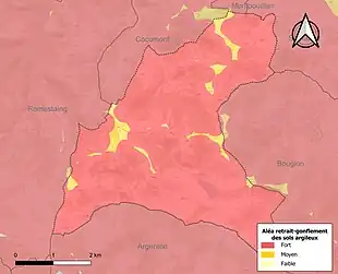 Le retrait-gonflement des sols argileux est susceptible d'engendrer des dommages importants aux bâtiments en cas d’alternance de périodes de sécheresse et de pluie[19]. La totalité de la commune est en aléa moyen ou fort (91,8 % au niveau départemental et 48,5 % au niveau national)[Carte 2]. Depuis le , en application de la loi ELAN, différentes contraintes s'imposent aux vendeurs, maîtres d'ouvrages ou constructeurs de biens situés dans une zone classée en aléa moyen ou fort[Note 3],[20].