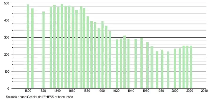 | L'évolution du nombre d'habitants est connue à travers les recensements de la population effectués dans la commune depuis 1800. Pour les communes de moins de 10 000 habitants, une enquête de recensement portant sur toute la population est réalisée tous les cinq ans, les populations légales des années intermédiaires étant quant à elles estimées par interpolation ou extrapolation[23]. Pour la commune, le premier recensement exhaustif entrant dans le cadre du nouveau dispositif a été réalisé en 2006[24]. En 2021, la commune comptait 249 habitants[Note 4], en diminution de 1,19 % par rapport à 2015 (Lot-et-Garonne : −0,66 %, France hors Mayotte : +1,84 %). |