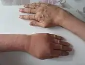 Selon les individus, l'effet peut être bénin ou grave, en fonction du nombre de piqûres et du fait de la présence de substances sensibilisantes dans la composition du venin, mais seuls 2 % des humains sont mis en danger par une seule piqûre de cet insecte[18]. Une guêpe injecte environ de deux à dix microgrammes de venin, donc une vingtaine de guêpes peuvent envoyer un humain adulte à l'hôpital ou même tuer un chien de 5 kg[19],[20]. Une personne n'a la plupart du temps qu'une rougeur localisée, un œdème qui peut être très douloureux et quelques démangeaisons. En fonction de la zone touchée (yeux, bouche…), en cas de piqûres très nombreuses ou sur un petit animal, ou bien encore en cas d'aggravation et de symptômes d'allergie, il convient de prendre d'urgence un avis médical[17],[18],[21]. Une quinzaine de personnes meurt par piqûres d'hyménoptères (abeilles, guêpes et frelons) par an en France, principalement chez les personnes allergiques[22]. Seule la femelle est pourvue d'un aiguillon venimeux.