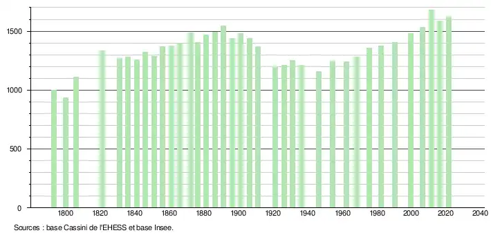L'évolution du nombre d'habitants est connue à travers les recensements de la population effectués dans la commune depuis 1793. Pour les communes de moins de 10 000 habitants, une enquête de recensement portant sur toute la population est réalisée tous les cinq ans, les populations légales des années intermédiaires étant quant à elles estimées par interpolation ou extrapolation[24]. Pour la commune, le premier recensement exhaustif entrant dans le cadre du nouveau dispositif a été réalisé en 2006[25].