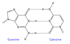 Comme l'adénine et la cytosine, la guanine est présente à la fois dans l'ARN et dans l'ADN. Elle s'apparie à la cytosine par 3 liaisons hydrogène. Le groupe aminé de la cytosine agit comme donneur pour la création des liaisons hydrogène, tandis que les groupes carbonyle C-2 et amine N-3 agissent comme récepteurs. À l'inverse, le groupe carbonyle C-6 de la guanine agit comme receveur tandis que les groupes N-1 et C-2 agissent comme donneurs.