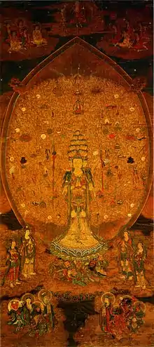 Guanyin aux Mille Mains et aux Mille Yeux. Dynastie Song, 12e siècle. Couleurs sur soie. 79.2 x 176.8 cm. Musée national du Palais (Taïwan)[alpha 1]