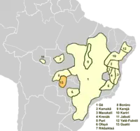 Le guató en jaune foncé, dans l'ensemble macro-jê
