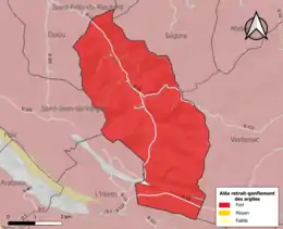 Les mouvements de terrains susceptibles de se produire sur la commune sont soit des chutes de blocs, soit des glissements de terrains, soit des effondrements liés à des cavités souterraines, soit des mouvements liés au retrait-gonflement des argiles. Près de 50 % de la superficie du département est concernée par l'aléa retrait-gonflement des argiles, dont la commune de Gudas[35]. L'inventaire national des cavités souterraines permet par ailleurs de localiser celles situées sur la commune[36].