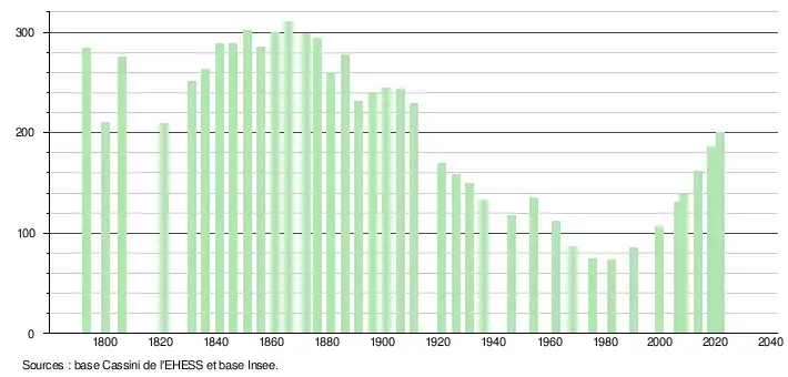 | L'évolution du nombre d'habitants est connue à travers les recensements de la population effectués dans la commune depuis 1793. Pour les communes de moins de 10 000 habitants, une enquête de recensement portant sur toute la population est réalisée tous les cinq ans, les populations légales des années intermédiaires étant quant à elles estimées par interpolation ou extrapolation[40]. Pour la commune, le premier recensement exhaustif entrant dans le cadre du nouveau dispositif a été réalisé en 2008[41]. En 2021, la commune comptait 200 habitants[Note 7], en augmentation de 12,36 % par rapport à 2015 (Ariège : +1,38 %, France hors Mayotte : +1,84 %). |