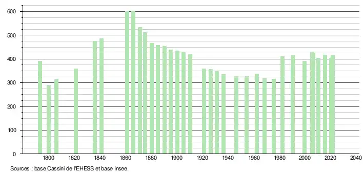 L'évolution du nombre d'habitants est connue à travers les recensements de la population effectués dans la commune depuis 1793. Pour les communes de moins de 10 000 habitants, une enquête de recensement portant sur toute la population est réalisée tous les cinq ans, les populations légales des années intermédiaires étant quant à elles estimées par interpolation ou extrapolation[18]. Pour la commune, le premier recensement exhaustif entrant dans le cadre du nouveau dispositif a été réalisé en 2005[19].