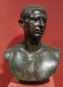 À la fin de l'année 47, César rejoignit l'Afrique, où les survivants des armées de Pompée s'étaient réfugiés sous l'autorité de Metellus Scipion et de Caton d'Utique (Caton le Jeune). Ils y trouvèrent un allié en la personne de Juba Ier de Numidie. Les forces pompéiennes, qui comptaient dix légions et 15 000 cavaliers, étaient certes nombreuses, mais manquaient d'homogénéité, car on y trouvait plus de troupes indigènes que de Romains. César, qui manquait de bateaux de transport, fit passer ses troupes en Afrique de manière graduelle. En débarquant à Hadrumète, il ne disposait que de 3 000 fantassins et 150 cavaliers[14]. Lors du débarquement survint un incident souvent cité qui aurait pu constituer un présage défavorable : César trébucha et tomba de tout son long. Il s'en tira par une pirouette, en faisant semblant de s'être volontairement jeté sur la terre pour l'embrasser[15]. Il s'employa à attirer dans son camp le roi Bocchus II de Maurétanie qui attaqua le territoire du roi Juba, obligeant ce dernier à abandonner temporairement les pompéiens. César employa l'hiver à renforcer ses troupes, accueillant de nombreux transfuges du camp adverse. Refusant toute bataille rangée, il s'appliqua à harceler ses adversaires. Le moment venu, ayant reçu les derniers renforts qu'il attendait de Sicile, il vint mettre le siège devant la ville de Thapsus. Les pompéiens se portèrent à sa rencontre, comme il le souhaitait. Le , lors de la bataille de Thapsus, César remporta une victoire décisive. Juba Ier était absent, avec son armée, car il apprit l'attaque du roi de Maurétanie Bocchus II, sur sa capitale Cirta[16]. Il laissa ensuite trois légions poursuivre le siège de Thapsus et marcha avec les autres vers Utique. Caton, qui était gouverneur de la ville, comprit que la résistance était vaine et se suicida. Quant à Scipion, il se précipita dans la mer au terme d'un engagement naval, alors qu'il tentait de gagner l'Espagne.